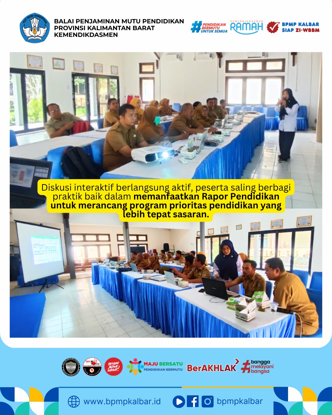 Sebagai upaya memperkuat tata kelola satuan pendidikan melalui perencanaan berbasis data, BPMP Kalbar menyelenggarakan pendampingan pemetaan penggunaan Rapor Pendidikan untuk mendorong pemanfaatan data secara lebih optimal. Rapor Pendidikan bukan sekadar angka namun referensi akurat dalam membantu sekolah dan daerah melihat kondisi nyata mutu pendidikan.